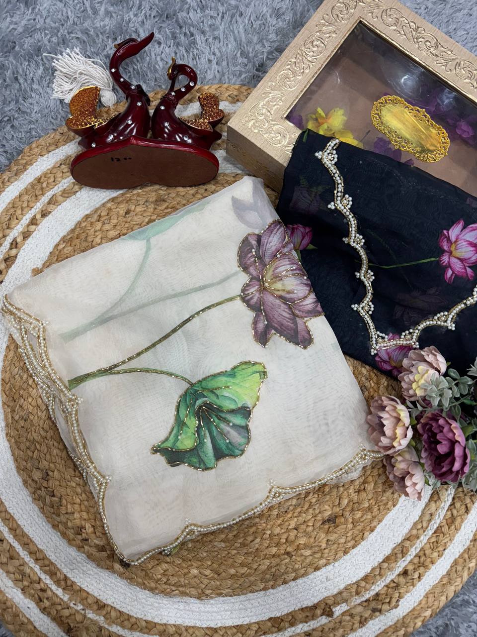Soft Organza Saree with floral print, beads, and katdana handwork. Includes matching printed blouse. Priced at βΉ5,399.00.